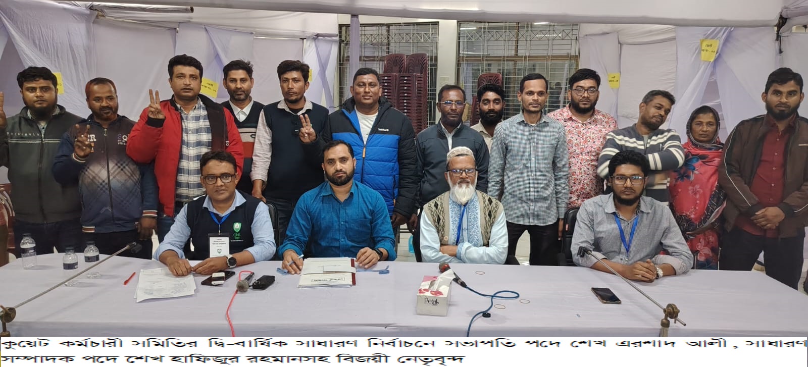 খুলনা প্রকৌশল ও প্রযুক্তি বিশ্ববিদ্যালয় (কুয়েট) কর্মচারী সমিতির কার্যনির্বাহী পরিষদের দ্বি-বার্ষিক নির্বাচন অত্যান্ত উৎসবমুখর ও শান্তিপূর্ণ পরিবেশে কঠোর নিরাপত্তা ব্যবস্থা এবং সুশৃঙ্খল পরিবেশে সম্পন্ন হয়েছে। নির্বাচনে সভাপতি পদে শেখ এরশাদ আলী(সিনিয়র অফিস সহায়ক) এবং সাধারণ সম্পাদক পদে শেখ হাফিজুর রহমান(সিনিয়র ল্যাব সহকারী) নির্বাচিত হয়েছেন।