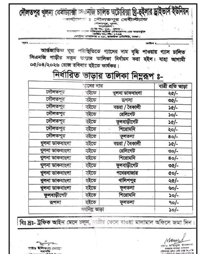আন্তর্জাতিক প্রেক্ষাপটে জ্বালানি তেলের সংকট ও মূল্যবৃদ্ধির ধারাবাহিক প্রভাব এবার পড়েছে স্থানীয় পরিবহন খাতে। এরই ধারাবাহিকতায় দৌলতপুর-খুলনা রুটে চলাচলকারী সিএনজি চালিত অটোরিকশার ভাড়া বৃদ্ধি করেছে সংশ্লিষ্ট সংগঠন।
